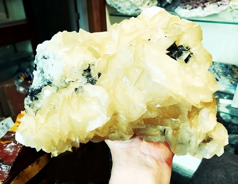 CLICK for 4 Views! 13.5" - 14 Lbs. XLarge Gorgeous Rare Yellow Angel Wing-type CALCITE on slight Black Sphalerite (One of my BEST)